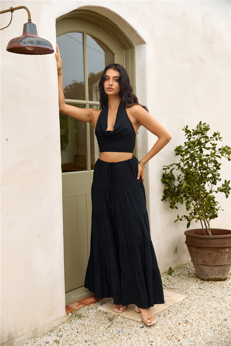 Dazzle under the stars with our Fancy Evenings Halter Top in Black. Whether you’re sipping champagne at a rooftop lounge or dancing the night away at a gala event. this top exudes timeless elegance. ensuring you make a stunning impression at any fancy affair. Pair with the matching Fancy Evenings Maxi Skirt.