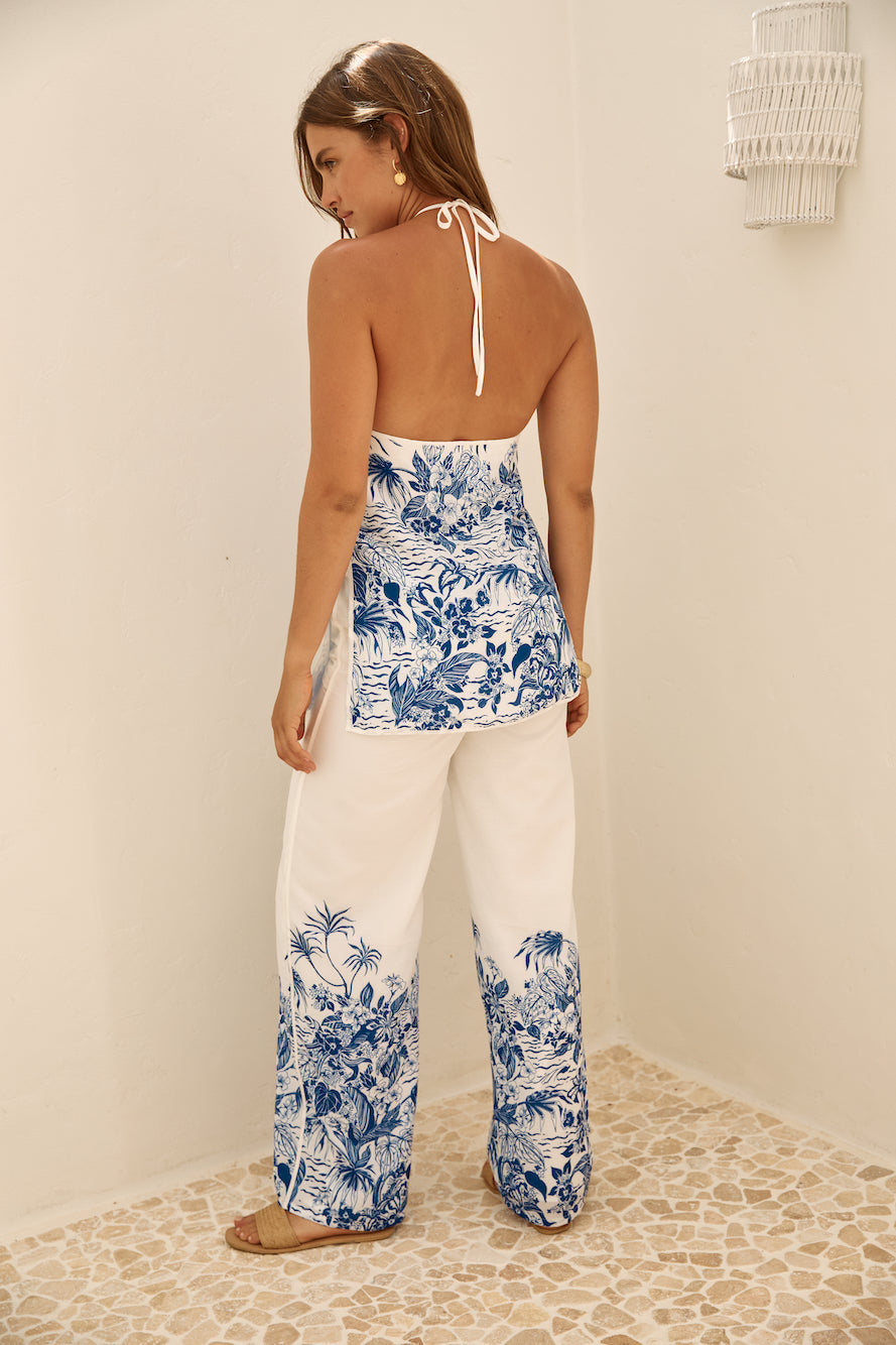 The SEVEN WONDERS Valencia Halter Top in Blue is an ode to the fauna of our wildest dreams. Featuring a longline silhouette and lightweight design. this top is the perfect piece to adorn on those hot summer nights in Santorini. Pair with denim shorts and sandals for the ultimate laid-back look.